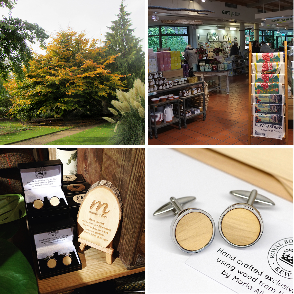 From top left: Parrotia Persica tree // Kew gift shop // Our cufflinks on display in the gift shop // Our exclusive Kew wood cufflinks