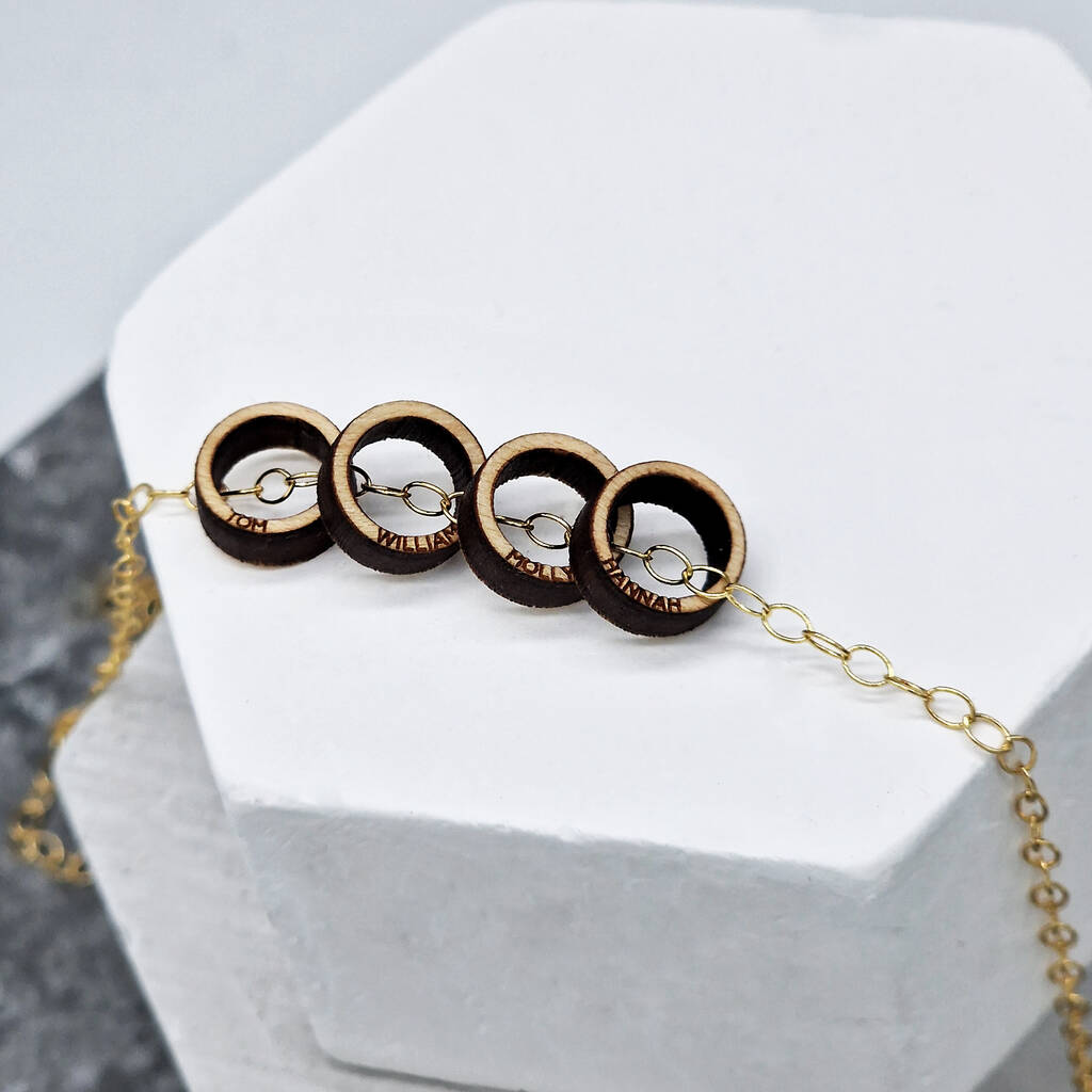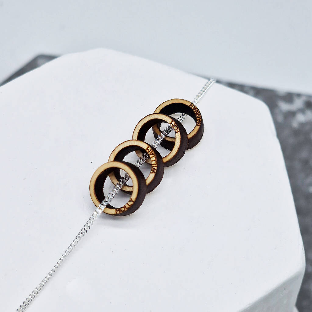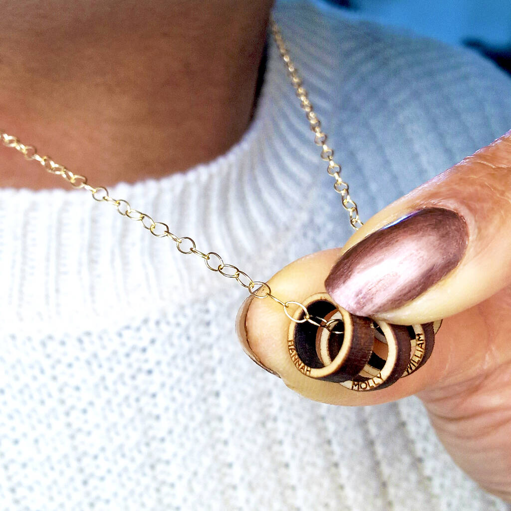 A unique wooden necklace with individually laser etched beads which include each family members name, attached to either a gold filled or sterling silver chain