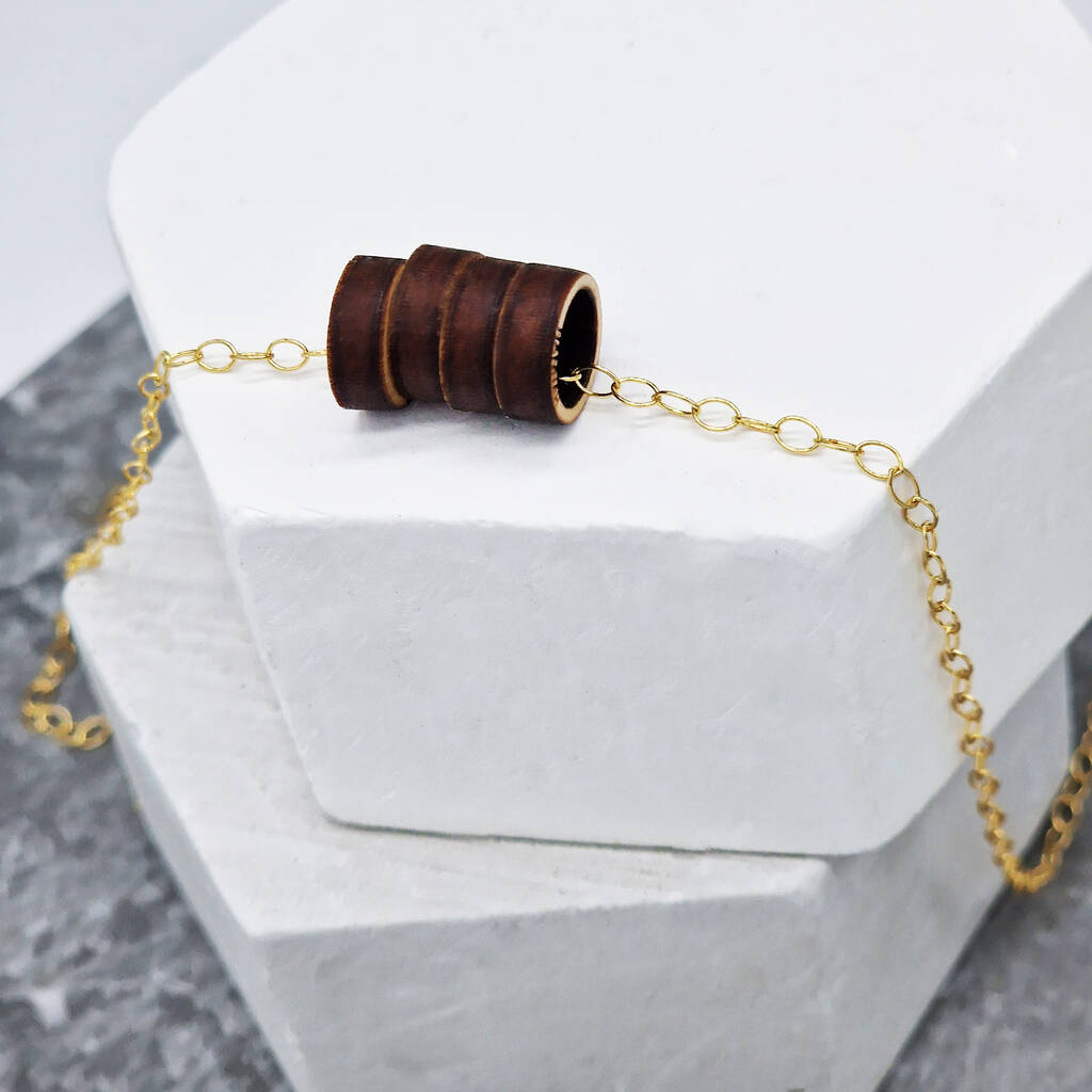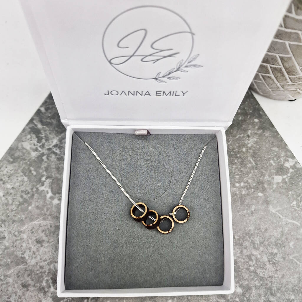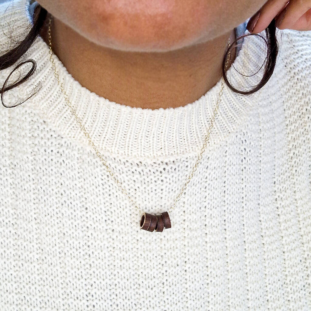 A unique wooden necklace with individually laser etched beads which include each family members name, attached to either a gold filled or sterling silver chain