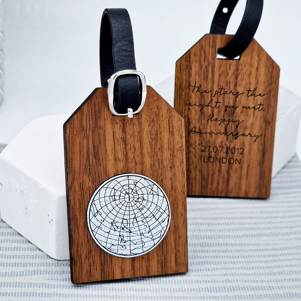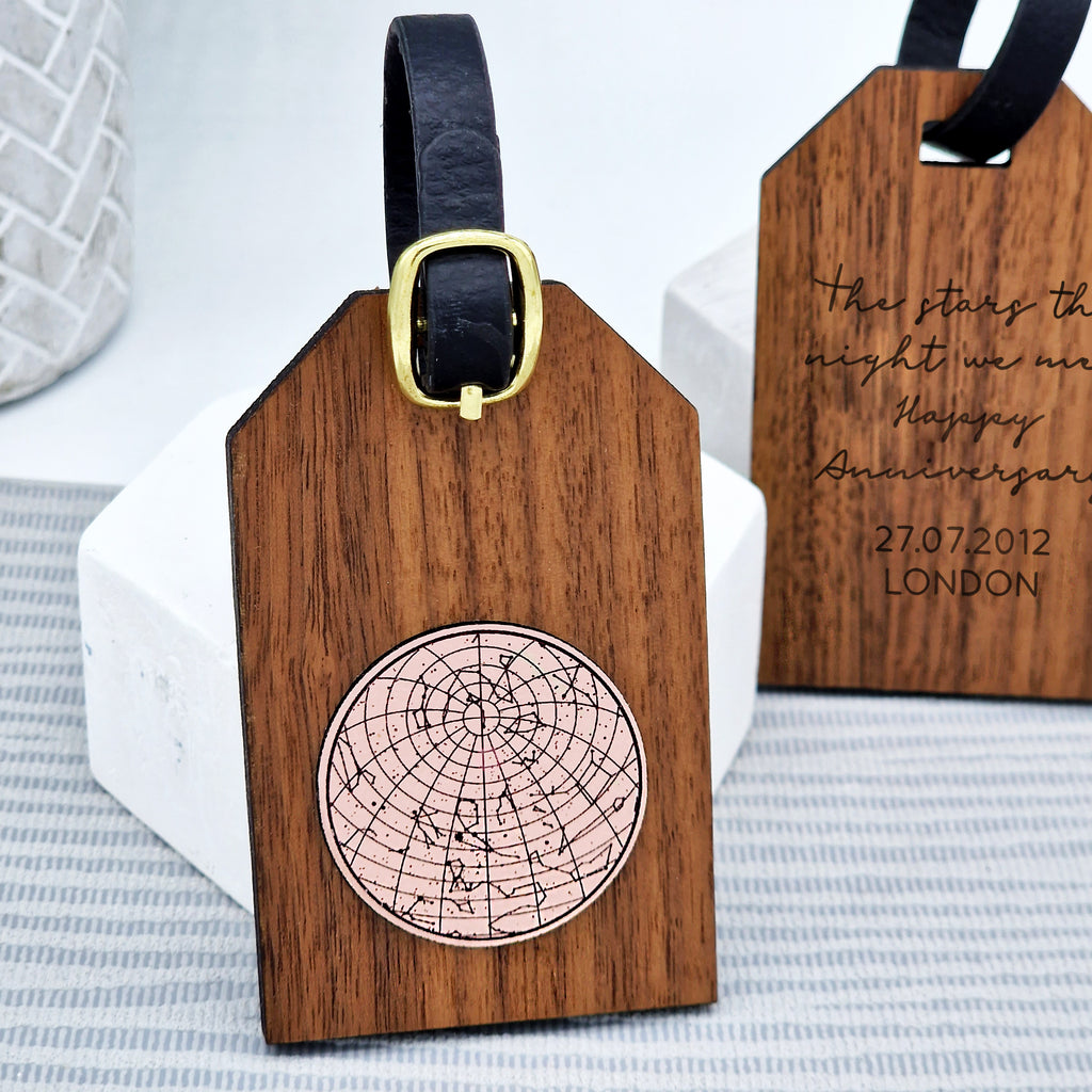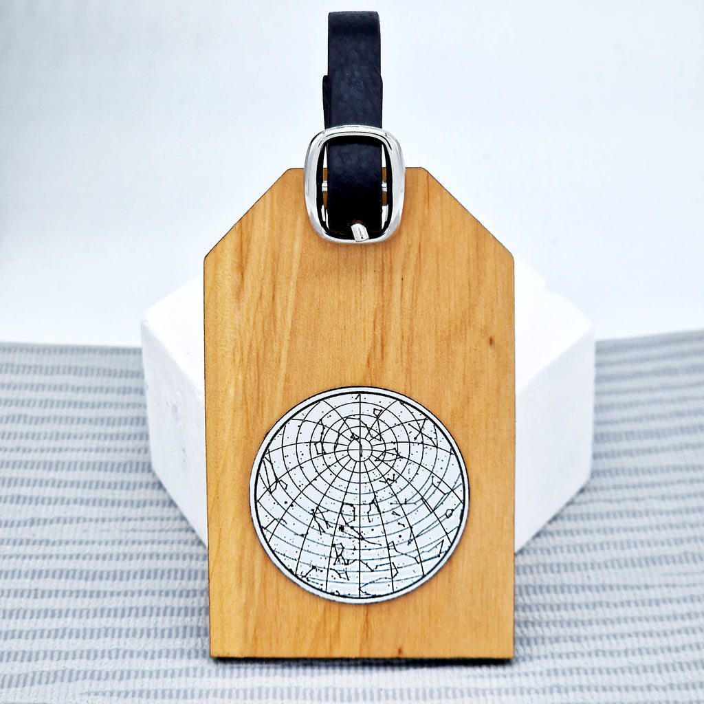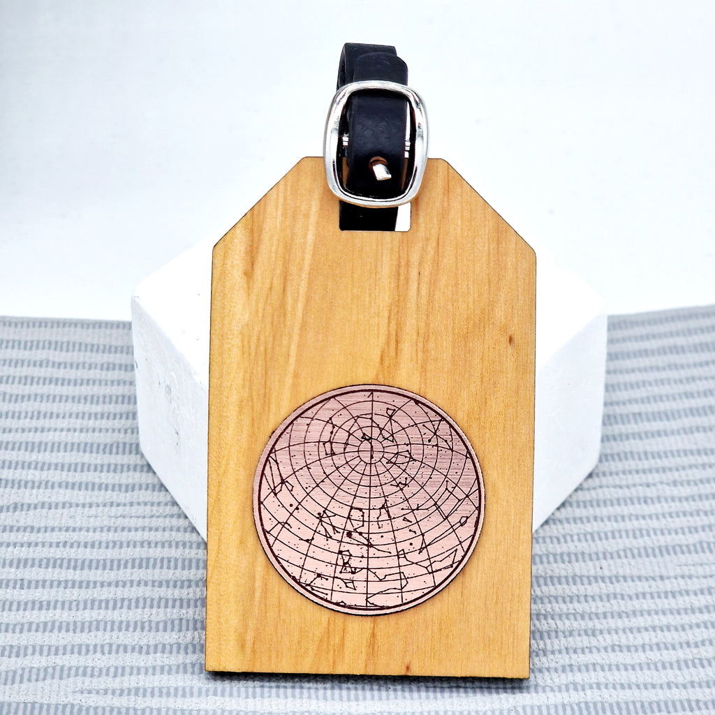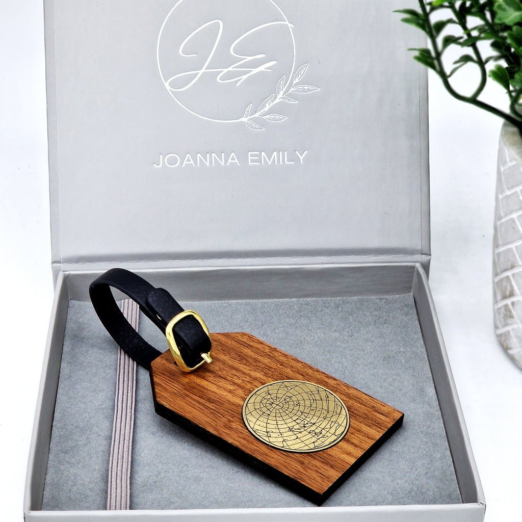 This tag is available in either Walnut wood (dark) or Alder wood (light) and the star map can be etched onto either gold, silver or rose gold brushed inlay.