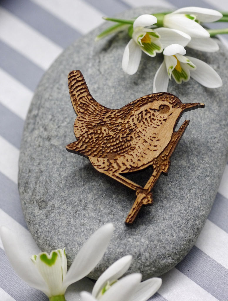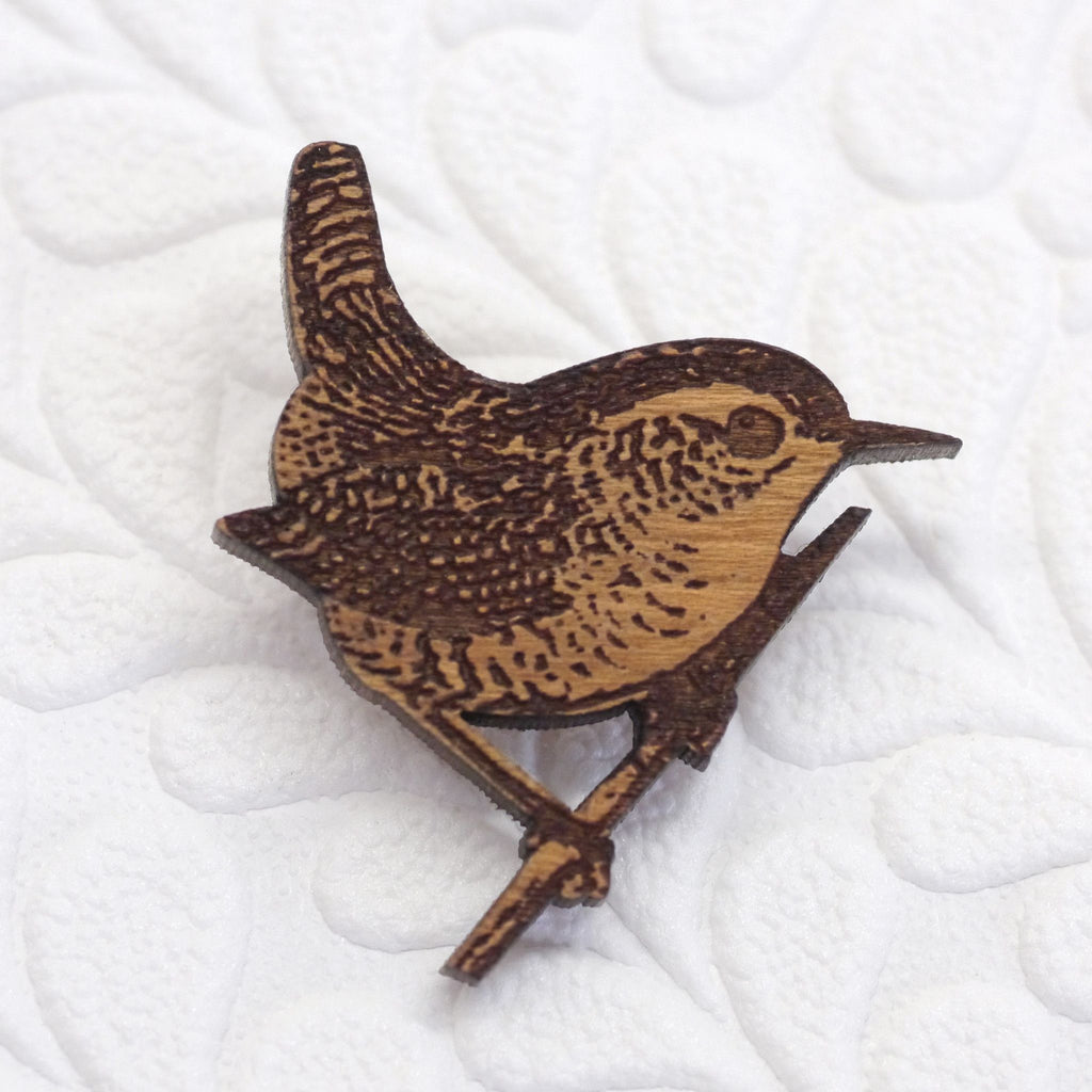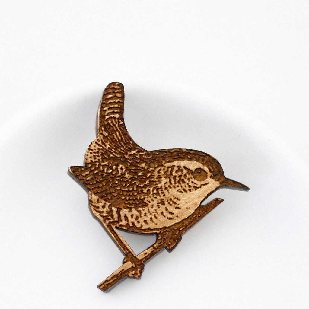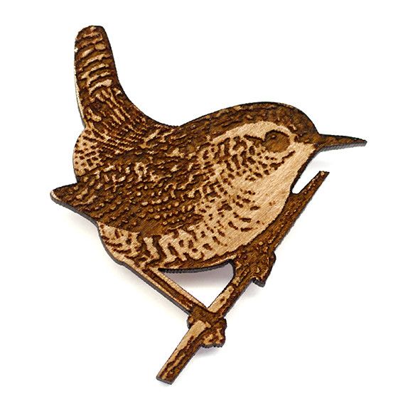 A beautiful wooden brooch, featuring a detailed illustration of a wren perching on a branch.