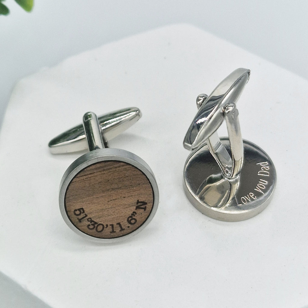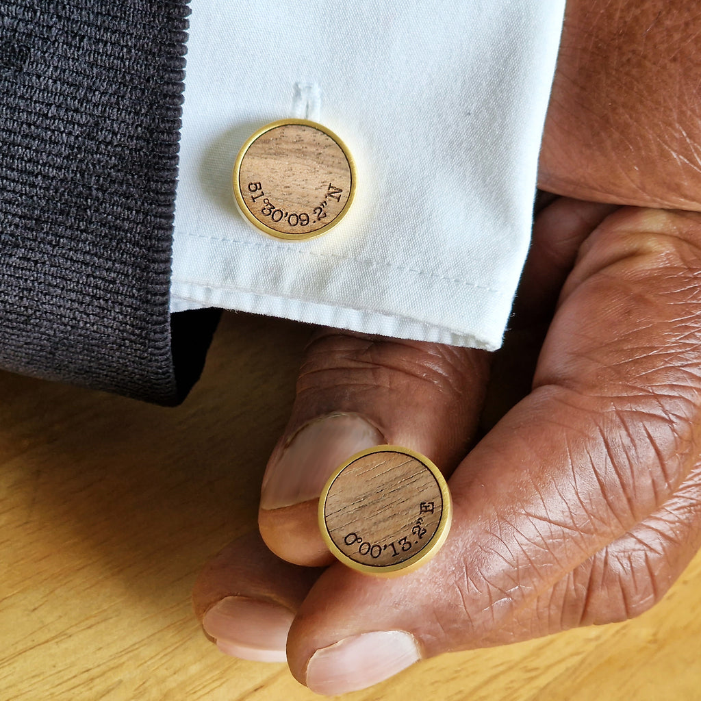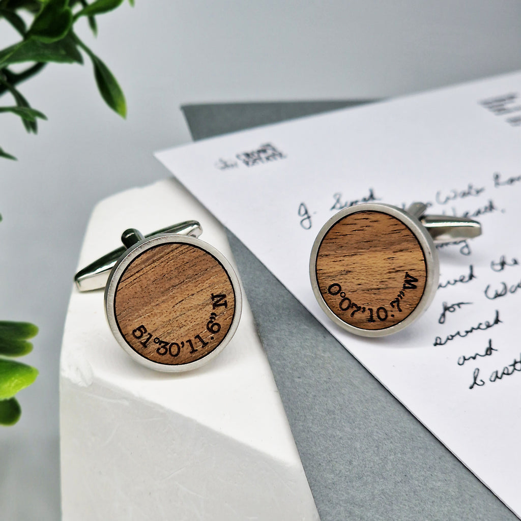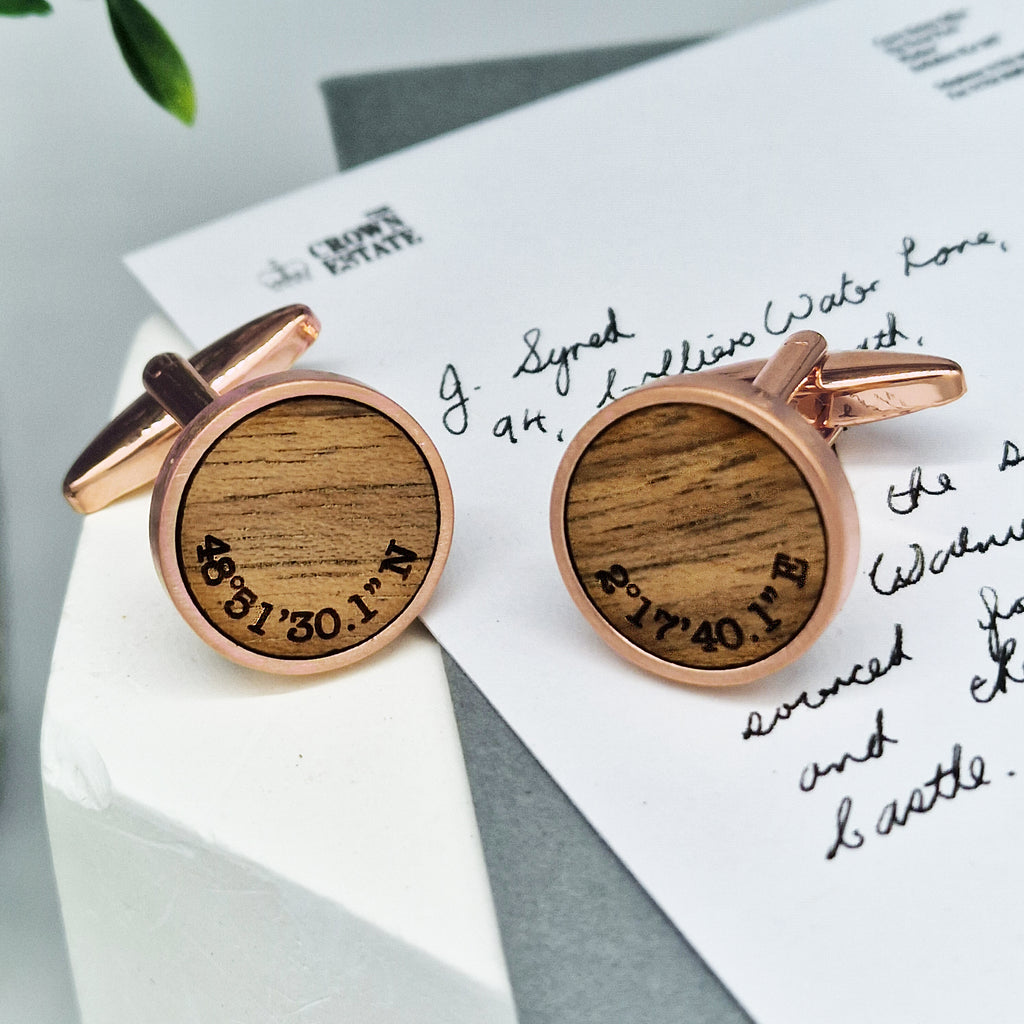 Luxurious walnut wood cufflinks personalised with coordinates and an optional secret message on the back.
