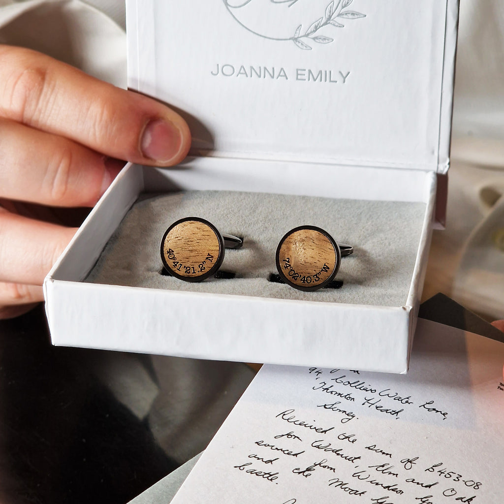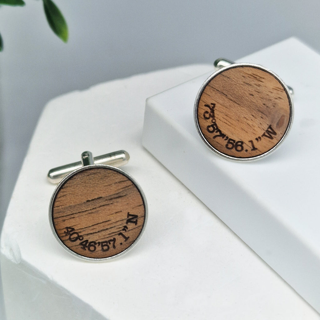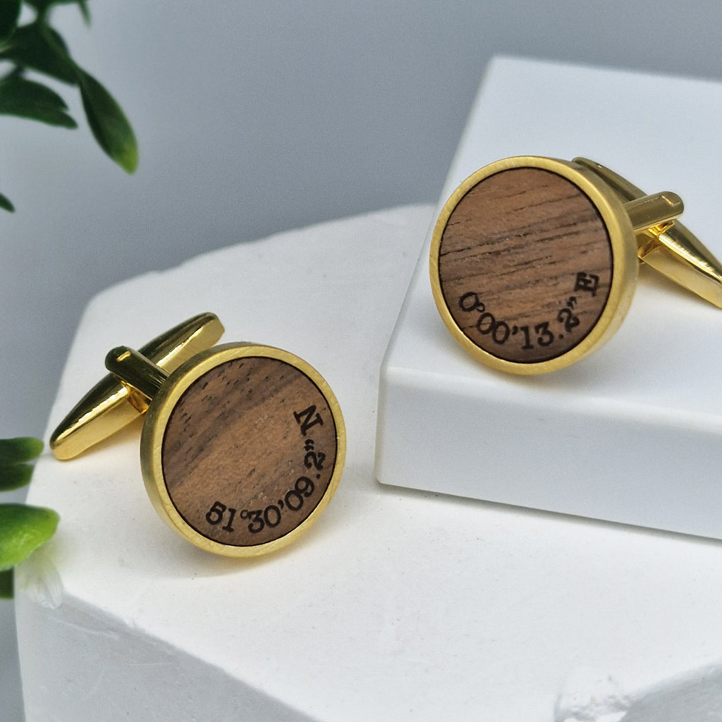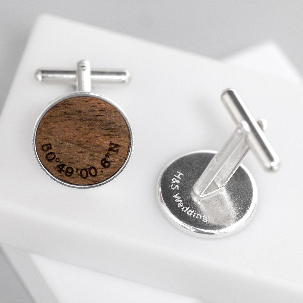 Luxurious walnut wood cufflinks personalised with coordinates and an optional secret message on the back.