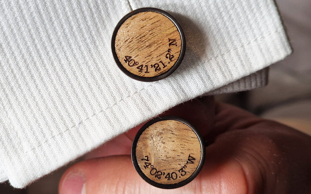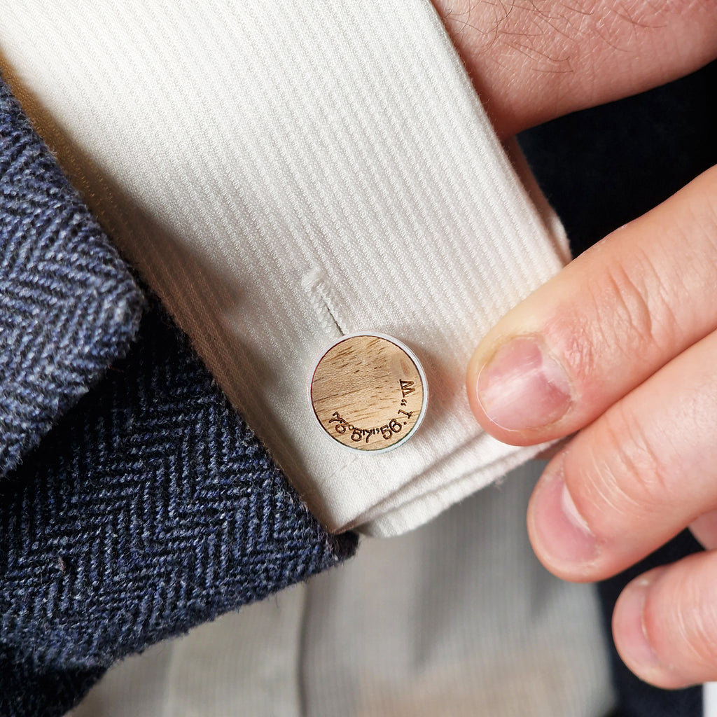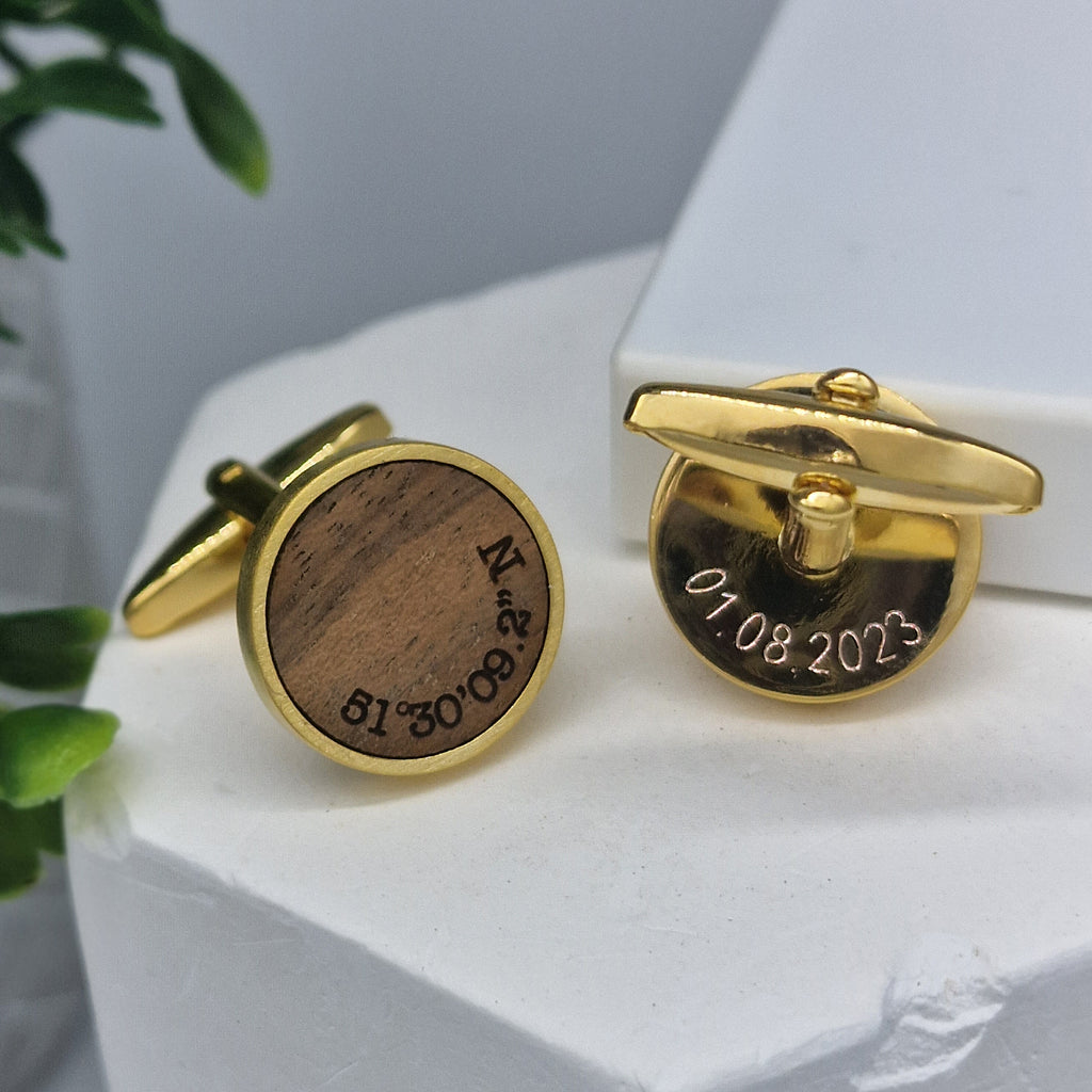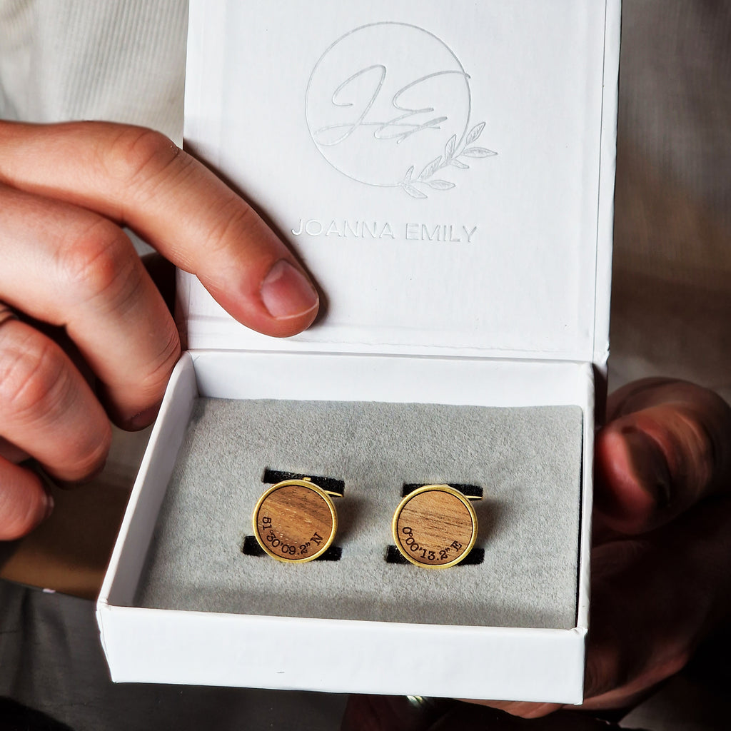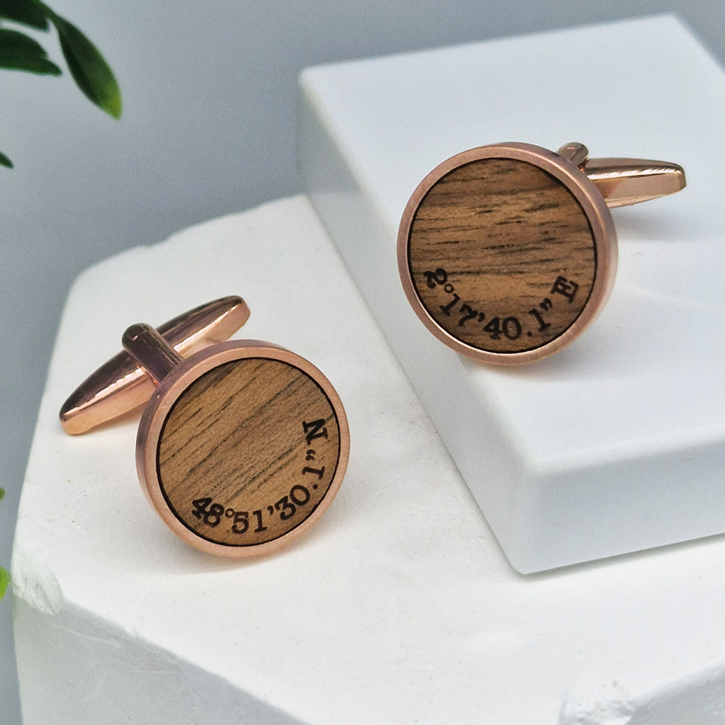 Luxurious walnut wood cufflinks personalised with coordinates and an optional secret message on the back.
